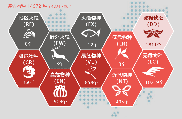 在中國內地的物種評估中,紅色名錄共涵蓋了12,553種物種,其中1,829種被認定為面臨滅絕威脅。